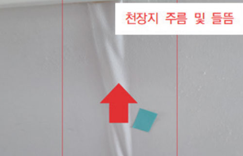 “거실 천장 도배 주름 및 들뜸” 건은 공사상 잘못으로 인한 석고보드 접합부 단차, 천장지 주름 및 들뜸이 발생하여 미관상 지장을 초래하고 있으므로 시공하자로 판단함