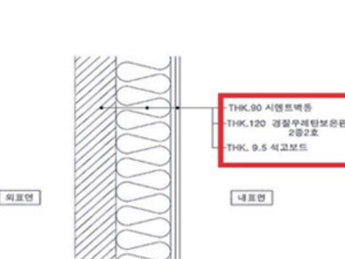 - 사용검사도서 검토 결과, ‘THK90 시멘트벽돌 / THK120 경질우레탄보온판2종2호 / THK9.5 석고보드’ 표기가 확인됨.
